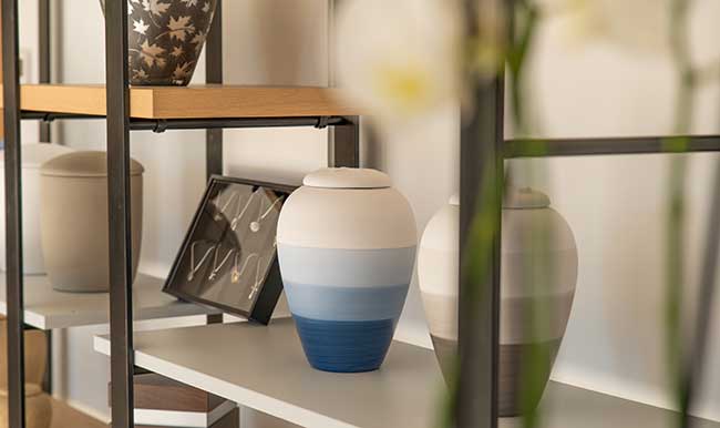 Las urnas para cenizas están disponibles en los servicios funerarios en una amplia variedad de materiales, desde madera como las Ukitu hasta cerámica, arcilla, vidrio, latón o alabastro como las Moon.