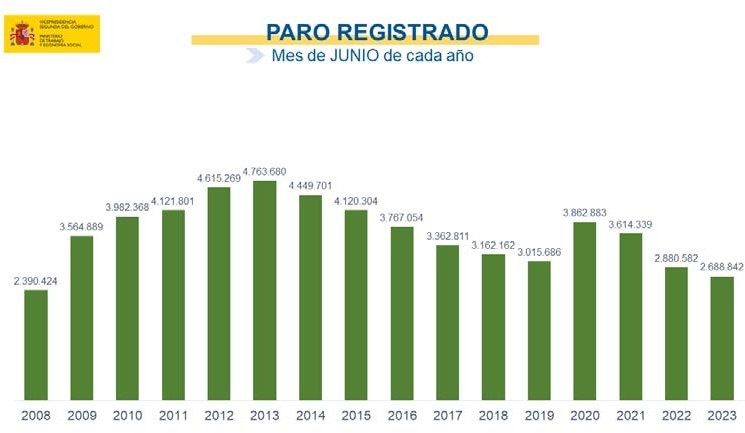 El número de personas registradas en las oficinas del Servicio Público de Empleo Estatal (SEPE), al finalizar el mes de junio ha bajado en 50.268 personas (-1,84%), con respecto al mes anterior, tal y como ha informado este martes, 4 de julio, el Ministerio de Trabajo y Economía Social. El paro registrado se ha situado en un total de 2.688.842 personas, la cifra más baja de los últimos 15 años, en concreto desde septiembre 2008. En los últimos 12 meses la reducción ha sido de casi 200.000 personas (- 191.740 personas, el -6,66%).