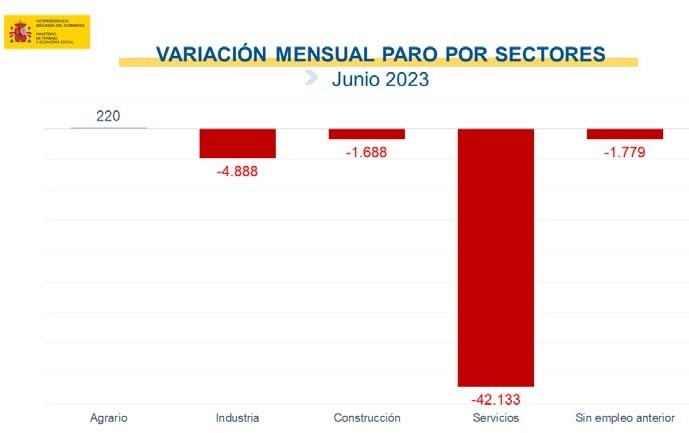 En términos interanuales, el sector Servicios arroja casi 110.000 personas en desempleo menos (-109.754) que en junio del año pasado, mientras que en Agricultura son 40.302 menos, en Industria 21.544 menos y en Construcción 19.028 personas menos.
