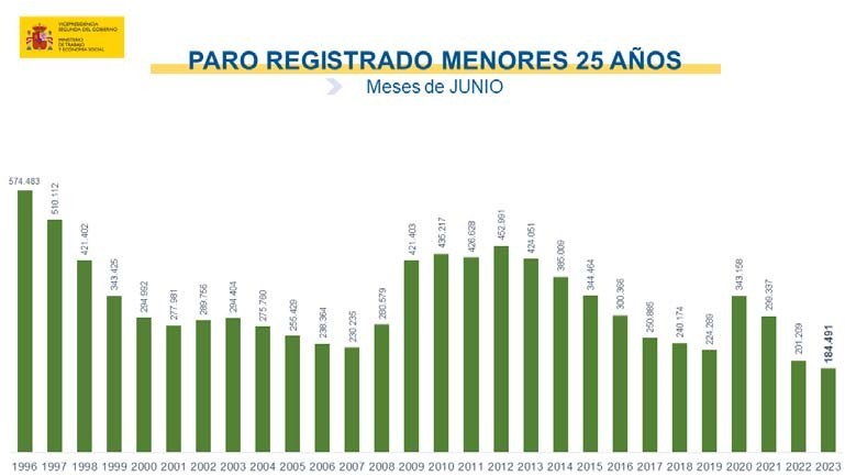En el mes de junio se ha vuelto a registrar un nuevo mínimo histórico en relación con las y los jóvenes menores de 25 años inscritos en el SEPE, que se ha reducido a 184.491 personas. Esta cifra es casi la mitad de la registrada en febrero de 2021.
