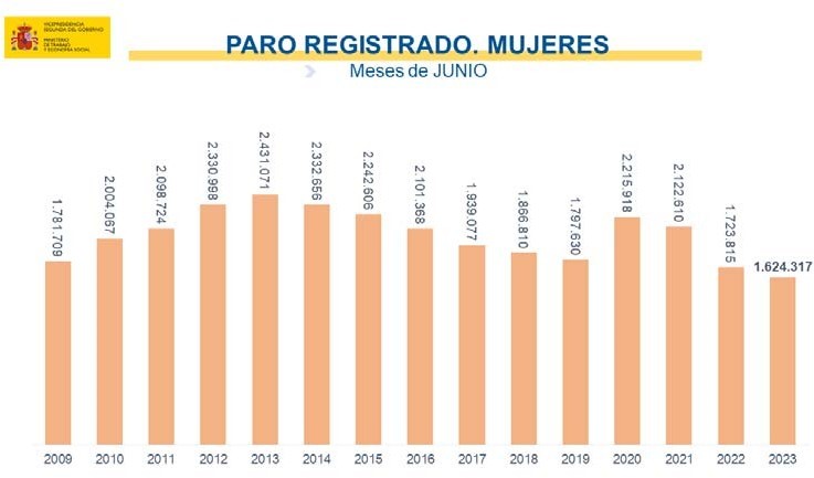 Si se compara con junio del año pasado, el paro femenino cae prácticamente en 100.000 personas (-99.498 personas).