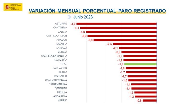 En el conjunto de las 17 comunidades autónomas se ha contabilizado un descenso generalizado durante el mes de junio. En cifras absolutas Andalucía (-8.780 personas), Cataluña (-6.359 personas) y Galicia (-5.410 personas) son las comunidades autónomas donde se ha registrado un mayor descenso.