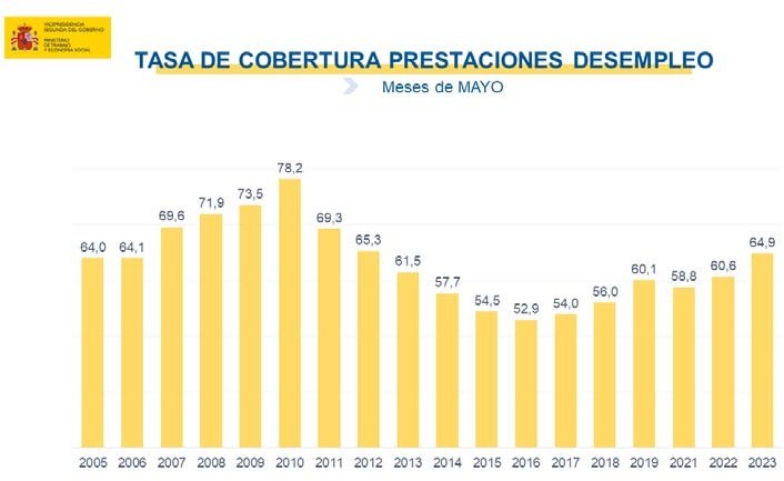 La cobertura del sistema de protección por desempleo durante el mes de mayo de 2023 ha sido del 64,93%, el mismo indicador en mayo de 2022 fue de 60,65%.