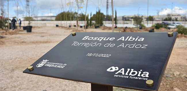 Mediante un acuerdo de colaboración entre Grupo Albia y el Ayuntamiento de Torrejón de Ardoz, se ha realizado, con la ayuda de decenas de voluntario/as de la compañía funeraria, la reforestación de 150 árboles. Entre ellos se encuentran especies como Pyrus Calleryana, Photinia Red Robin, Cupresus Sempervirens, Morus Alba Frutiless y Liquidambar Styraciflua. El terrero reforestado cuenta con una extensión de 1.483 m2, reforzando la cantidad y densidad de las plantaciones actuales. Así, se ha transformado la zona en un nuevo pulmón verde para la localidad, que cuenta con mayor capacidad para actuar como sumidero de carbono y depurador de los contaminantes del aire.