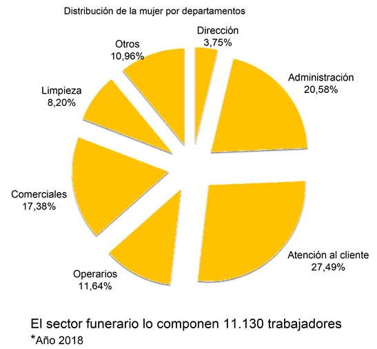 Las mujeres ocupan principalmente los departamentos de Administración y Atención a las familias. El 11,64% de los operarios funerarios son mujeres. Un dato muy significativo ya que tradicionalmente este trabajo ha sido ejercido por hombres.